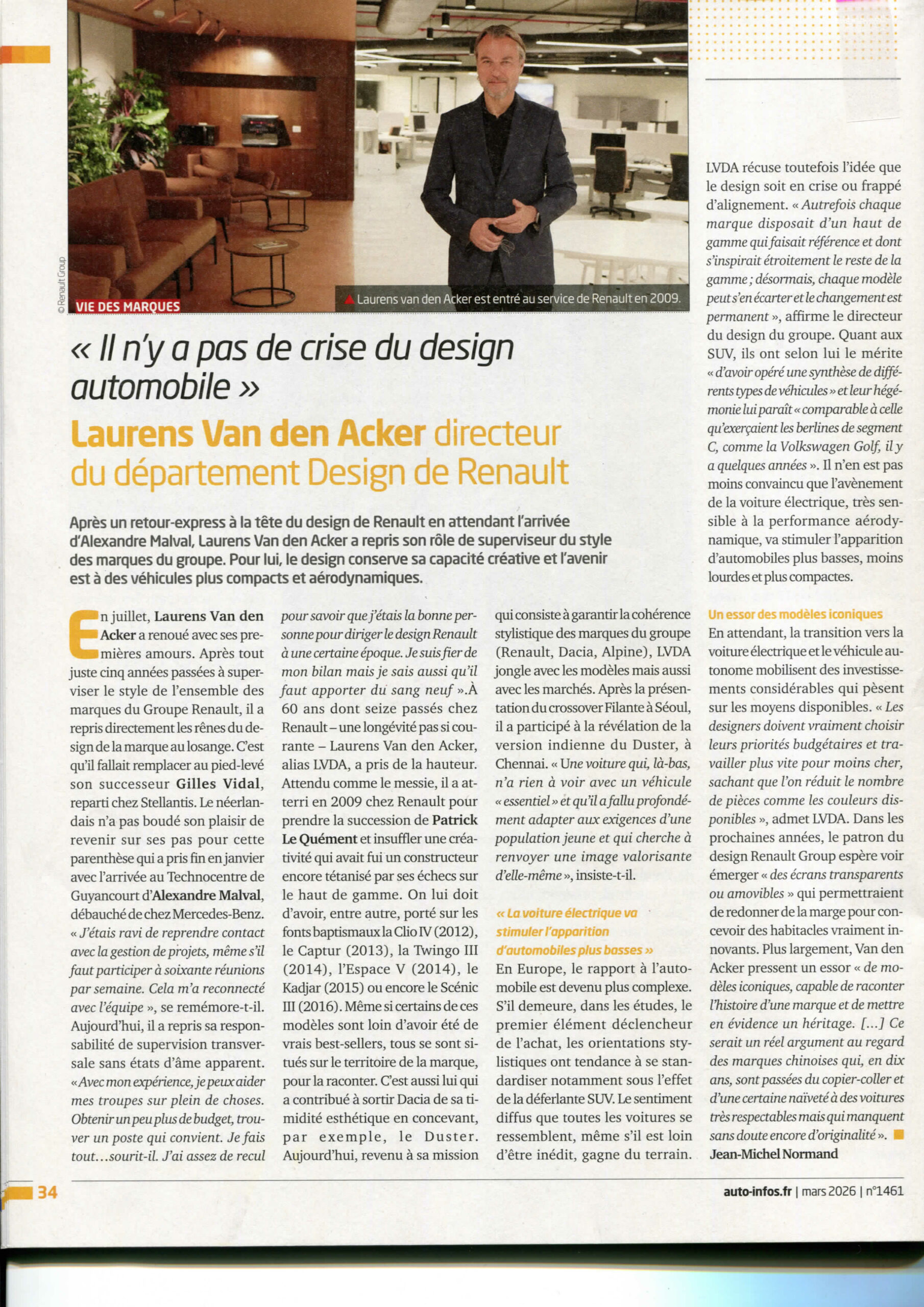 Dans un entretien accordé à la presse spécialisée automobile (Auto Infos, mars 2026 / article ci-contre), le Directeur du design du groupe Renault, rappelle combien le design automobile reste un levier essentiel d’innovation et d’attractivité, capable de susciter l’émotion tout en accompagnant les évolutions du marché.