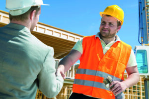 Architect and construction worker shaking hands.